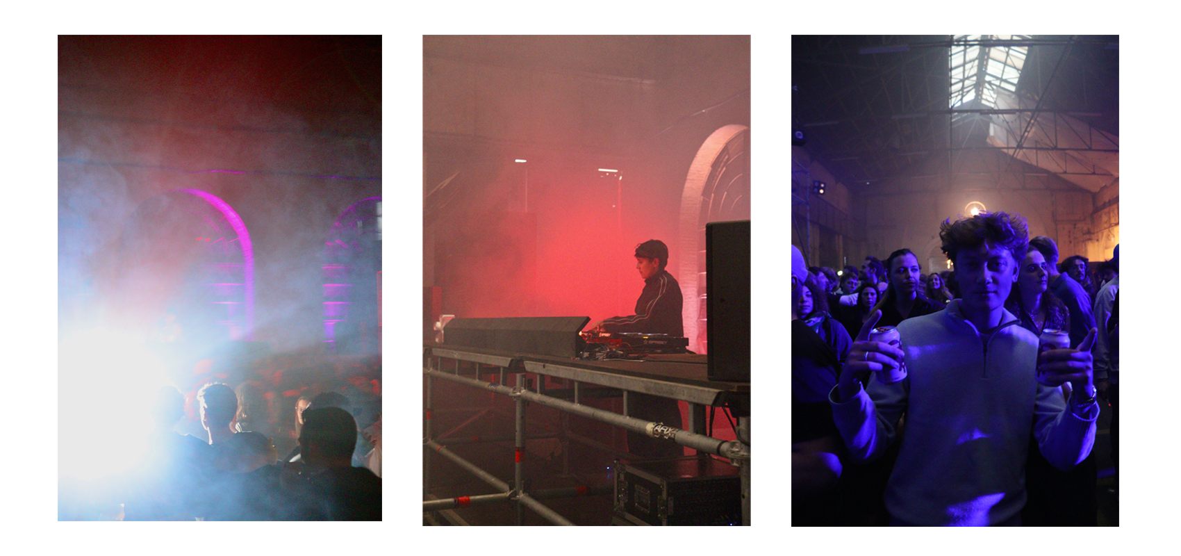 Niet alles is even goedkoop: bijna vier euro voor een pint en twaalf euro voor een burger. Maar er is wel keuze, ook voor vegetariërs. En omdat ik vroeg was en mijn ticket terugkreeg in drankjetons, voelde het alsof ik uitgenodigd was, niet uitgeperst. Dat detail typeert Spreey: het is een evenement dat nadenkt over hoe mensen zich welkom voelen. Pas tegen zonsondergang verandert de sfeer echt. De lichten dimmen, de muziek wordt dieper, de bas zwaarder. De hal vult zich met rook, kleuren en lichamen. Wat begon als een dagfeest, eindigt als een volwaardig clubmoment. Het voelt alsof Gentbrugge even Berlijn is, maar dan vriendelijker, warmer. Buiten kleurt de lucht oranje, binnen wordt ze paars.